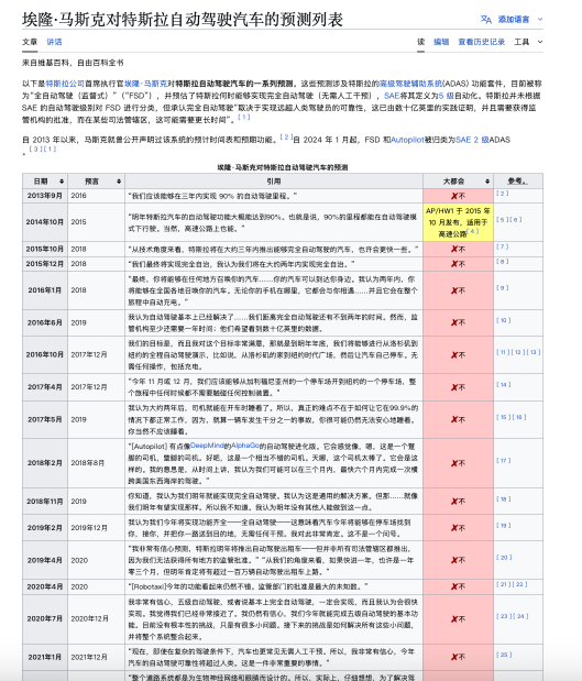 维基百科上有一个“埃隆·马斯克对特斯拉无人驾驶汽车的预测列表”,罗列了马斯克的21项明确了时间的承诺,并表明是否已经实现。其中 19 项他未能实现,它们都被标记为难看的红色。