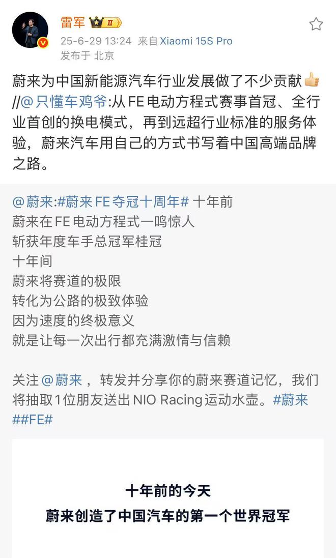 雷军点赞蔚来:为中国新能源汽车行业发展做了不少贡献 访客 2025-06-29 18:55:34 116 默认 摘要: 今年是蔚来夺得FE电动方程式历史上首个年度车手总冠军的十周年。今日,雷军转发蔚来博文并:“蔚来为中国新能源汽车行业发展做... 今年是蔚来夺得FE电动方程式历史上首个年度车手总冠军的十周年。今日,雷军转发蔚来博文并:“蔚来为中国新能源汽车行业发展做了不少贡献。”李斌回复雷军:“一起加油”。 标签: 方程式 新能源 海报 阅读 QQ 分享 微博分享 微信分享 分享 上一篇马斯克公布脑机接口重大进展:受试者增至7人,未来有望控制人形机器人 下一篇莲花汽车回应关闭英国工厂:公司运营一切正常,没有关闭任何工厂的计划 马斯克公布脑机接口重大进展:受试者增至7人,未来有望控制人形机器人上一篇 莲花汽车回应关闭英国工厂:公司运营一切正常,没有关闭任何工厂的计划下一篇 相关推荐 方程式新能源 曝字节视觉大模型负责人杨建朝内部官宣休息,周畅接任 2025-07-17 杭州成立专班介入处理宗庆后遗产纠纷 2025-07-17 爱康国宾曾因体检漏检被索赔15万 2025-07-17 三兄妹在港起诉宗馥莉文书曝光 2025-07-17 爱康集团回应“女子漏检癌症”事件:将邀请第三方机构及专家分析原因 2025-07-17 2025暑期档总票房破35亿 2025-07-17 美团王莆中:将保证美团骑手收入永远在蓝领第一梯队 2025-07-17 卢伟冰:小米深圳大厦明天正式开园 2025-07-17