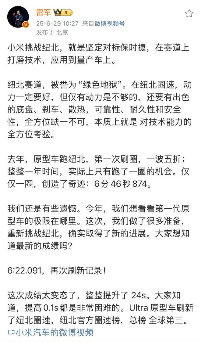 雷军:小米挑战纽北,,就是坚定对标保时捷 访客 2025-06-29 18:56:05 147 默认 摘要: 今日,雷军发文称,“小米挑战纽北,就是坚定对标保时捷,在赛道上打磨技术,应用到量产车上。”据了解,今年小米Ultra第一... 今日,雷军发文称,“小米挑战纽北,就是坚定对标保时捷,在赛道上打磨技术,应用到量产车上。”据了解,今年小米Ultra第一代原型车重新挑战了纽北,并以6:22.091的成绩再次刷新纪录,相比去年提升了24s。 标签: 小米 保时捷 海报 阅读 QQ 分享 微博分享 微信分享 分享 上一篇莲花汽车回应关闭英国工厂:公司运营一切正常,没有关闭任何工厂的计划 下一篇索尼回应相机电池能否上飞机:相机电池不属于“充电宝”界定范畴 莲花汽车回应关闭英国工厂:公司运营一切正常,没有关闭任何工厂的计划上一篇 索尼回应相机电池能否上飞机:相机电池不属于“充电宝”界定范畴下一篇 相关推荐 小米保时捷 曝字节视觉大模型负责人杨建朝内部官宣休息,周畅接任 2025-07-17 杭州成立专班介入处理宗庆后遗产纠纷 2025-07-17 爱康国宾曾因体检漏检被索赔15万 2025-07-17 三兄妹在港起诉宗馥莉文书曝光 2025-07-17 爱康集团回应“女子漏检癌症”事件:将邀请第三方机构及专家分析原因 2025-07-17 2025暑期档总票房破35亿 2025-07-17 美团王莆中:将保证美团骑手收入永远在蓝领第一梯队 2025-07-17 卢伟冰:小米深圳大厦明天正式开园 2025-07-17