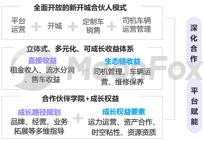 加强生态合作,促司乘及平台三方共赢:曹操出行发布新开城合伙人模式,通过资质授权、营销赋能、技术及金融支持等方式,为合作伙伴提供多维助力及可成长收益体系,预计将促进曹操出行业务扩张和运营优化,实现多方共赢。