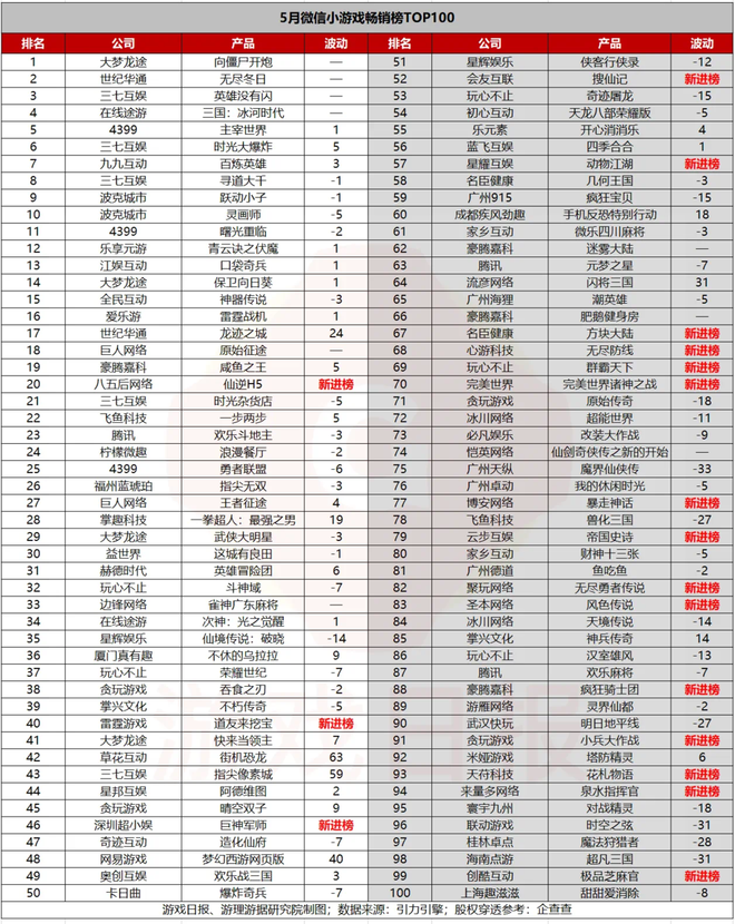 如今,整个行业已经从《羊了个羊》转发奖励社交裂变的思路进化到《咸鱼之王》社交裂变 + 买量驱动的新阶段再到《三国冰河时代》买量 + 社交 + IP 的全新打法,随着行业红利释放、开发者鱼贯而入,小游戏的玩法类型在不断丰富、品类也在持续创新——据 GameLook 统计,每月微信小游戏畅销榜 TOP100 会出现三十款左右的新游戏。