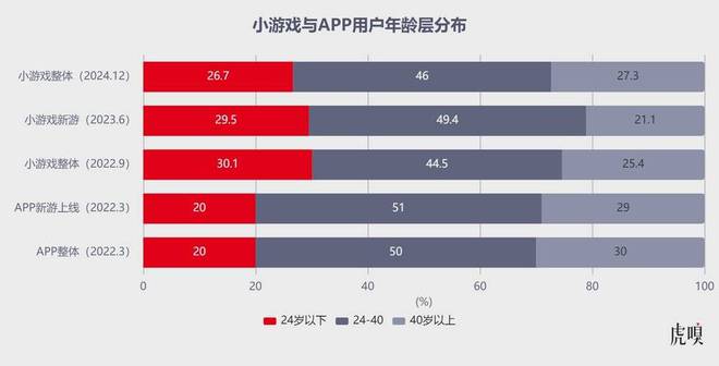 至于玩家地域分布,一二线与三四线用户并未在小游戏生态建立鄙视链,一二线用户占比近 50%,超半数用户分布在三线及以下城市,24 岁至 40 岁用户占比超过 45%——可见,无论高线精英还是小镇青年,都无法抵御在碎片化时间玩小游戏的诱惑。