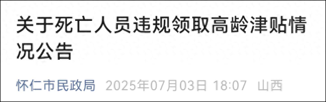近日,山西省怀仁市民政局发布关于死亡人员违规领取高龄津贴情况公告: