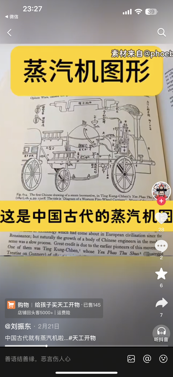 什么iPhone和蒸汽机是从《天工开物》来的、二进制是从《易经》来的,还是有大量人相信郑和宝船用的是蒸汽机,瓦特是看了中国神书才有了灵机一动,就连卖未成年科普读物的广告都拿这种说法当噱头,相当抽象。