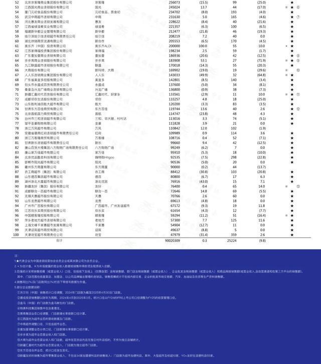 中国连锁经营协会提到,2024年,超市Top100企业销售规模约为9000亿元,同比增长0.3%;门店总数2.52万个,同比下降9.8%。销售额同比增长的企业有42家,门店增加的企业有25家。销售额、门店数双增长的企业有14家。