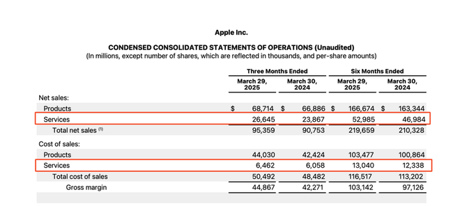苹果固然不愿意就此舍弃这份收益。过去几年,包括第三方抽佣在内的服务收入已经超越硬件收入成为苹果最重要的增长来源,且利润率常年居于 70%以上,堪称苹果的“印钞机”。今年第一季度,苹果服务收入达 266 亿美元,同比增长 12%,毛利率攀升至 75.7%,以三分之一的收入占比贡献了公司近 45%的毛利润。