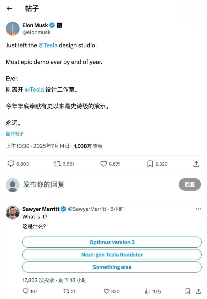 此次演示活动的具体内容尚未明确,但电动汽车分析师Sawyer Merritt预测,第三代Optimus机器人和下一代Roadster跑车可能是演示的重点。此前,马斯克曾提到Optimus人形机器人将迎来重大改进,该项目目前仍处于开发阶段,但已取得显著进展。而Roadster超跑的发布日期则尚未更新,马斯克强调特斯拉的重点仍是更具全球影响力项目。