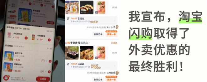 还有小伙伴纠结,是不是在配送费和包装费上做了文章?本编负责任告诉你,淘宝闪购完全没有动任何小心思,全部直接大力度补贴到位,有不少订单运费都直接免掉,2杯奶茶到手1块2、寿司三件套到手1块多、2块多、25减21、16减16等逆天神券屡见不鲜……