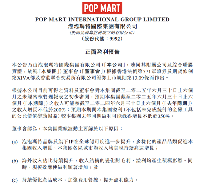 泡泡玛特发布公告,预期本集团截至2025年6月30日止六个月之收入可能较截至2024年6月30日止六个月之收入增长不低于200%;预期本期间本集团溢利(不包括未完成统计的金融工具的公允价值变动损益)较本集团去年同期溢利可能录得增长不低于350%。