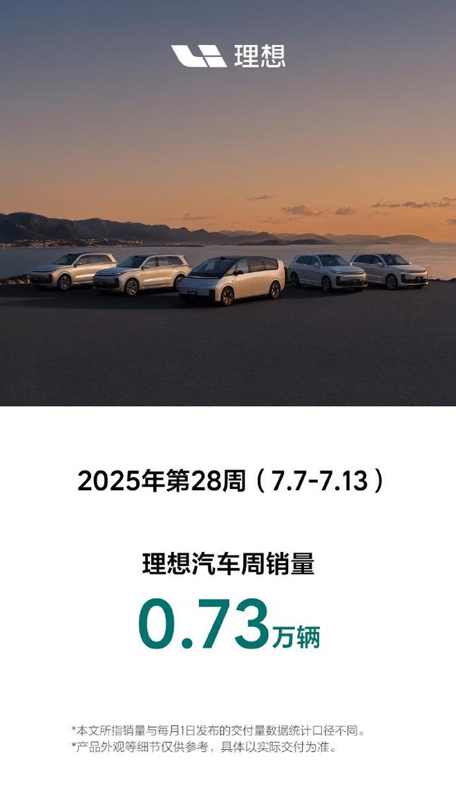 今日,理想汽车公布2025年第28周(7.7-7.13)销量:0.73万辆。