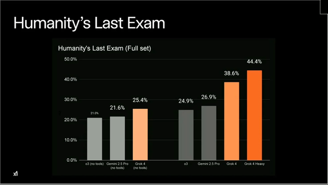在Grok 4推出之前,市面上最强大的模型在HLE上的表现普遍非常不理想,比如GPR-4o的准确率仅为2.7%。