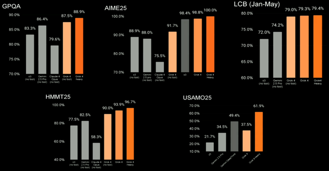 经过实测,Grok 4在多个Benchmark上均取得了优秀的成绩。在GPQA、AIME25、LCB(Jan-May)、HMMT25、USAMO25等多项测评中,Grok 4都超越了o3、Gemini 2.5 Pro、Claude 4 Opus等模型。