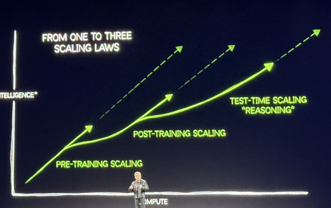 预训练、后训练、测试时均存在Scaling Law。过去两年以预训练为主,今年开始后训练、测试时推理需求快速增长。