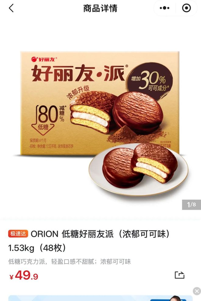根据山姆小程序,这款好丽友主打“减糖80%、增加30%可可成分、0反式脂肪”,48枚的规格(1.53kg)售价49.9元。