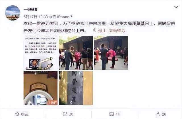 被迫勤奋的还有另外一家上市公司高澜股份的董秘,他发微博说,准备自费上一趟普陀山,为投资者祈福,在广东上市公司投资者集体接待日宣布的,说完就去了: