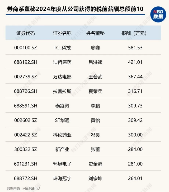 除了TCL科技董秘外,还有多位董秘在券商机构从业时间较长。比如泰凌微、新产业和珠海冠宇三家公司的现任董秘,在券商机构任职时间约6年。而迪哲医药董秘吕洪斌、拉普拉斯董秘夏荣兵、ST华通董秘黄怡之前在券商机构任职时间更是都长达11年。这三位董秘2024年度从任职公司获取的税前薪酬分别为421.01万元、316.71万元和309.42万元。