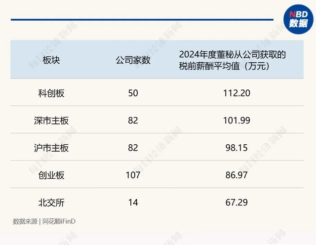 不过,五大板块(市场)之间的薪酬差异还是比较明显。其中科创板公司的"券商系董秘"2024年度从公司获取的税前薪酬平均值最高,达到112.20万元,深市主板公司紧随其后,"券商系董秘"平均值101.99万元。北交所公司券商系董秘平均薪资最低,约67.29万元。