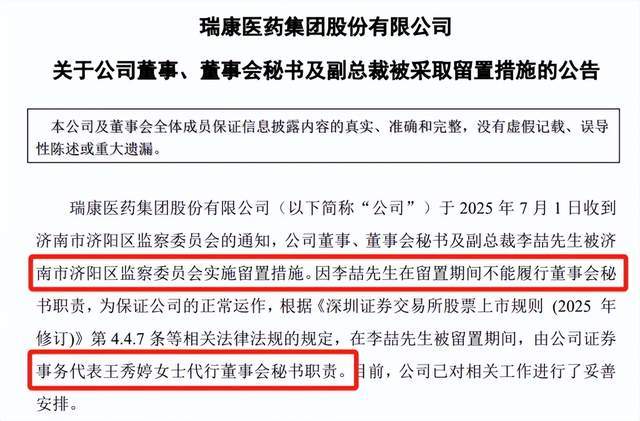 瑞康医药还表示,因李喆在留置期间不能履行董事会秘书职责,为保证公司的正常运作,根据相关法律法规的规定,在李喆被留置期间,由公司证券事务代表王秀婷代行董事会秘书职责。