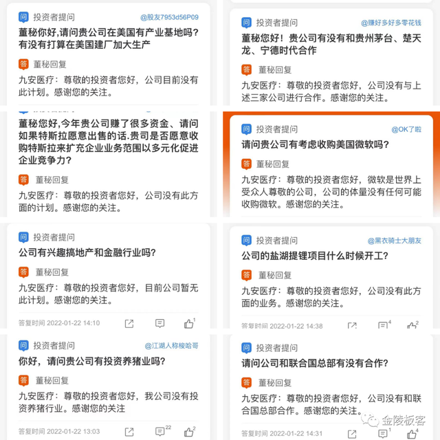 这活儿可累人了,之前九安医疗的董秘,就被称为回答投资者的劳模段子手,2022年初他们家跌惨了,股民涌进来问他,你们要不要在美国建厂,要不要收购特斯拉,要不要收购微软,要不要和茅台、宁德时代合作,要不要搞地产金融养猪?