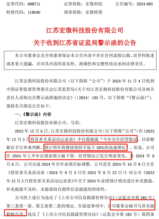 去年11月4日晚间,宏微科技公告收到江苏证监局的警示函,一起被警示的还有公司刚上任3个月的董秘。