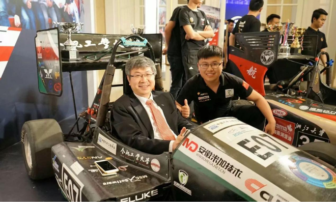 奇瑞董事长尹同跃(左),体验合工大云电车队的方程式赛车