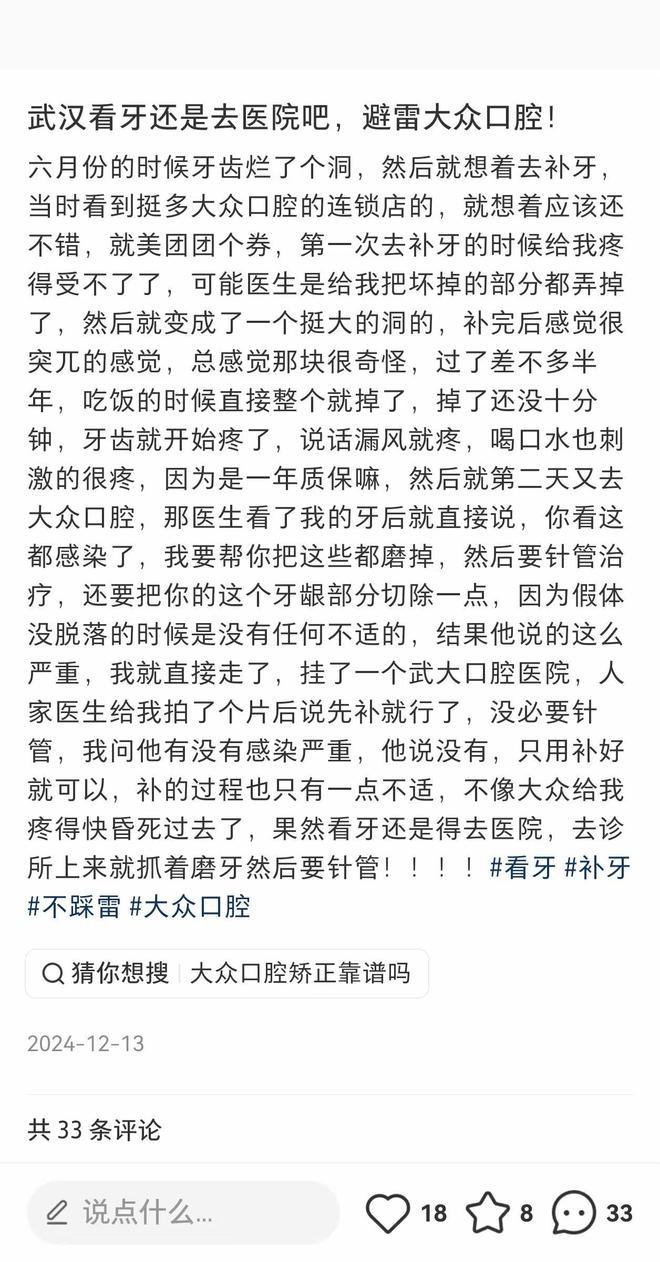 公立医院的专家资源和专业度或许是让患者更愿意选择的关键因素。事实上,蓝鲸新闻发现在社交平台上,多位患者对大众口腔的服务产生不满,反映问题包括过度医疗和治疗过程中更换医生等。