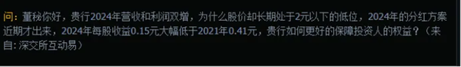 4月7日,一位投资者提出,贵行2024年营收和利润双增,为什么股价却长期处于2元以下的低位,2024年的分红方案近期才出来,2024年每股收益0.15元大幅低于2021年0.41元,贵行如何更好的保障投资人的权益?