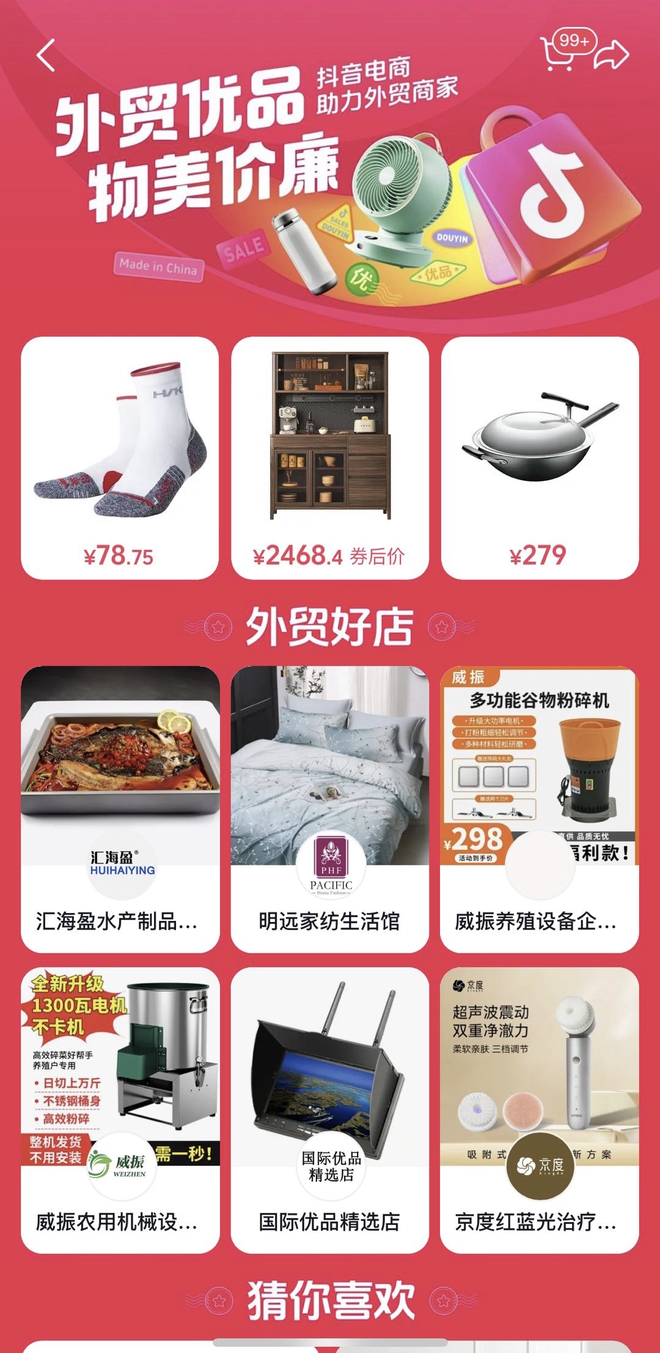 同时,为帮助外贸企业构建消费认知,更好地触达国内消费者,抖音电商、抖音生活服务业务将分别针对平台内不同经营场景的商家,设立外贸优品主题专区,并通过商品打标等多种方式,对外贸商家及优质货品给予专属流量扶持。平台还会定向邀请优质达人、商家等品质直播间,推出“外贸优品推荐官”,开展外贸商品专场直播,结合消费趋势打造更多优质带货内容。