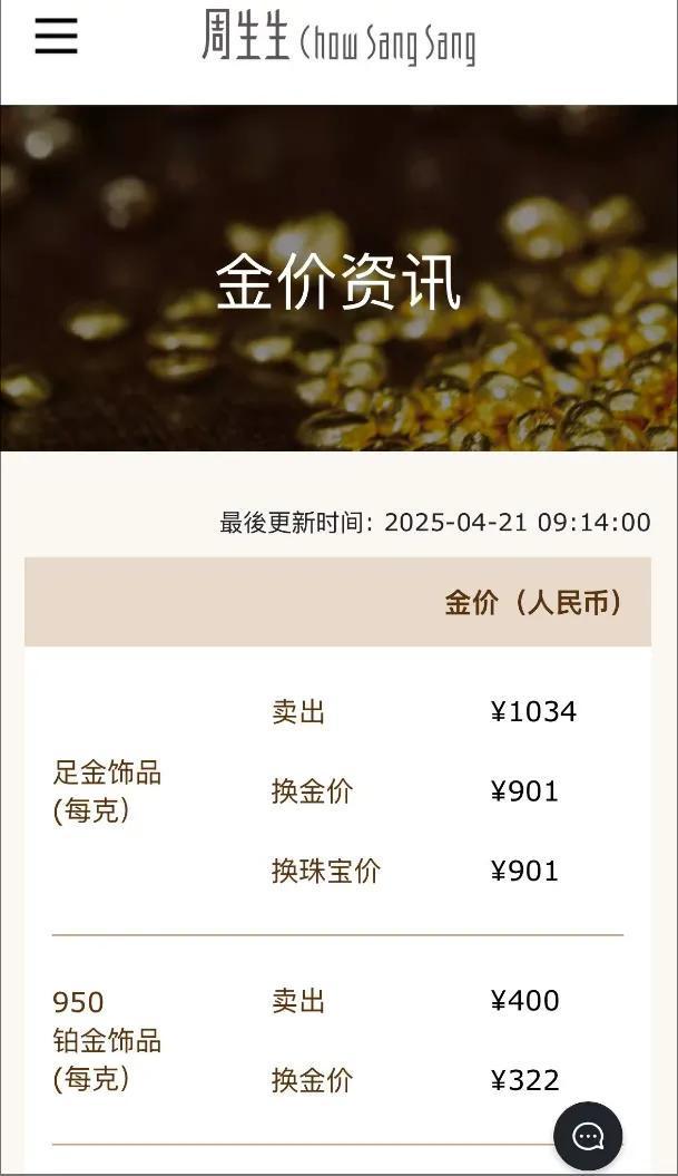 国内品牌金饰价格也随之上涨。中新经纬21日查询发现,周生生足金饰品标价已达1034元/克,相比4月7日低位912元/克,14日内累计涨122元。老庙、周大福足金饰品标价则分别攀升至1038元/克、1039元/克。