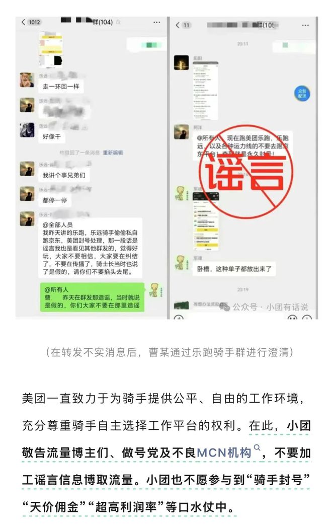 此前,美团官方账号“小团有话说”在4月19日针对“美团封杀骑手去某平台跑单”的网传言论发布辟谣声明。美团表示,近日,有多条包含“美团封杀骑手去某平台跑单”“不要去跑某平台,查到就是永久封号”等内容的聊天截图,在社交平台上广泛传播。在相关聊天截图流传出来后,第一时间与公司相关部门的同事核实,发现该截图中一名谣言传播者是安徽一外卖骑手。该骑手自述是从其他群里看到“乐跑、乐跑远骑手私自跑某平台,美团会永久封号处理”的谣言,觉得好玩,就在乐跑骑手群内转发。