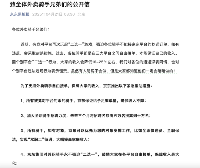 新的一周,京东外卖再度高调官宣。4月21日早间,“京东黑板报”发布《致全体外卖骑手兄弟们的公开信》,再度打出了一套组合拳...    新的一周,京东外卖再度高调官宣。