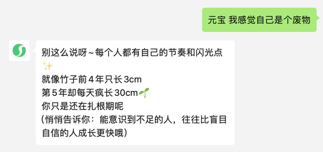 为了给元宝上上难度,我叠加了自嘲文化的buff,发送prompt:“元宝 我感觉自己是个废物”。