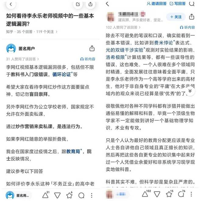 “李网红视频基本逻辑漏洞很多,包括但不限于教科书入门级错误、循环论证等”、“比如讲到费米悖论表达式,光的双缝干涉实验观测对实验结果的影响,洛希极限计算结果等,都有一些误导性的错误”、“李永乐的物理水平,真的是本科毕业很悬的水平”……