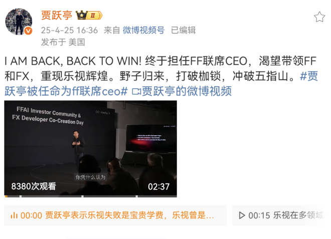 今日下午,贾跃亭发微博称,I AM BACK, BACK TO WIN! 终于担任FF联席CEO,渴望带领FF和FX,重现乐视辉煌。野子归来,打破枷锁,冲破五指山。