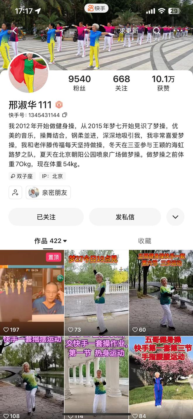 图 | 80岁的邢老师经常在快手上记录自己的跳操日常,吸引了不少操友的关注