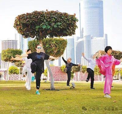 在阿联酋阿布扎比的一座公园内,当地民众练习太极拳右蹬脚动作。本报中东中心分社 塔里克·易卜拉欣 摄