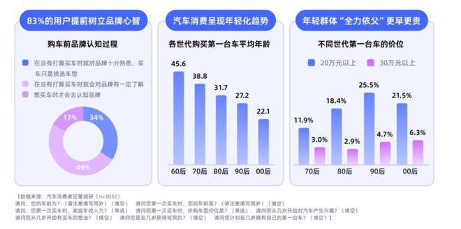 约四分之一的 90、00 后首次购车锁定 20 万元以上价格段,几乎是中高端汽车市场的潜在人群。