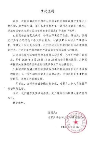 3月26日,曾黎工作室发布情况说明回应此事,称该倒卖行为系公司某员工个人私自所为,曾黎女士对此毫不知情。曾黎工作室表示,公司在发现该倒卖行为系该员工所为后,已立即开除了该员工,并于3月26日17点23分向公安机关报案。工作室将持续关注调查情况并依法追究涉事员工的法律责任。