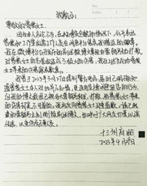 该网友发手写致歉函称,因自己的言论不当,在未知事实全貌的情况下发布的文章被扩散,给曾黎带来了伤害,因此深表歉意。并表示曾黎对二手平台售卖自己送给曾黎的徽章一事并不知情。