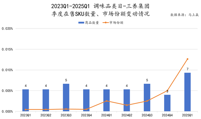 基于马上赢品牌 CT 中的数据,可以看到在调味品类目中,三养也已经有数款 SKU 持续在布局,且在 2024Q4,市场份额有较明显的提升。