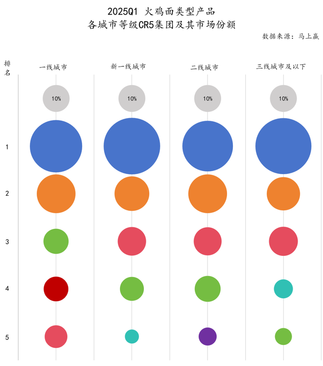 基于马上赢品牌 CT 中的数据,在 2025Q1,以各城市等级的火鸡面类型产品为市场份额整体,各城市等级 CR5 集团中的第一、第二均为白象、三养,从第三名开始则是今麦郎、康师傅等传统方便面巨头,以及同碗福、陈村、三只松鼠等在部分市场中表现较好的集团。