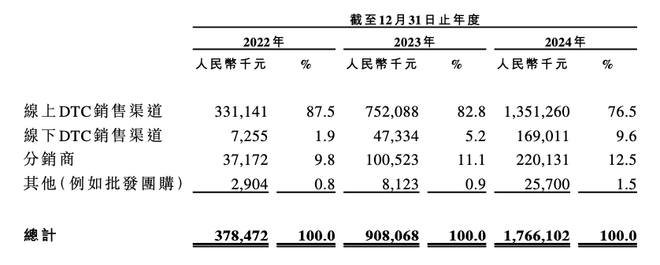 2022年到2024年,伯希和天猫自营店收入分别为1.3亿元、2.9亿元、5.2亿元,年复合增长率99.2%;抖音平台收入5440万元、1.73亿元、3.23亿元,年复合增长率143.8%;京东及唯品会第三方线上DTC收入分别为8960万元、1.78亿元、3.22亿元,年复合增长率89.7%。