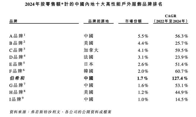根据招股书,按2024年零售额计算,中国内地前十大高性能户外服饰品牌分别为骆驼、北面、始祖鸟、迪卡侬、迪桑特、可隆、伯希和、凯乐石、哥伦比亚、探路者。其中,2024年,伯希和以17.66亿的销售额占据1.7%份额。