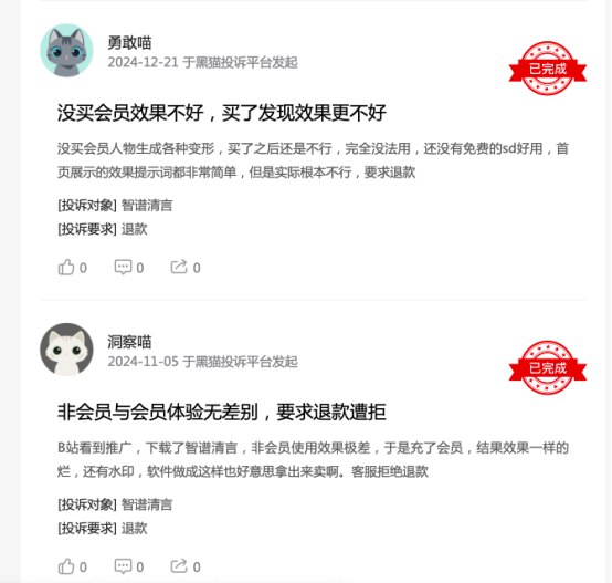 与此同时,黑猫投诉平台上也有针对智谱AI的具体案例。有用户提到,购买了智谱AI官网上的资源包后并未及时到账,并且联系客服后未得到回应,另外还有购买会员后效果并无明显提升等问题,不一而足。而在检索相关投诉信息时,笔者也发现一个有趣的现象,那就是很多用户都是在社交媒体平台看到相关视频宣传推广后,才起意进行会员购买。