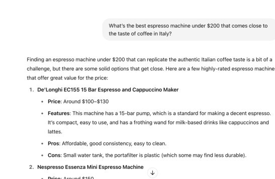 而从弗莱透露的信息来看,ChatGPT寻找推荐商品的“思维”会更难琢磨。“它不是在找某种特定的信号”,不会以关键词为核心。在网上寻找产品评论的时候,ChatGPT参考的内容源更广泛,不管是杂志的产品评测,还是Reddit论坛里的用户讨论,它都会分析。用户还可以告诉它,自己最希望重点参考什么渠道的产品评论。
