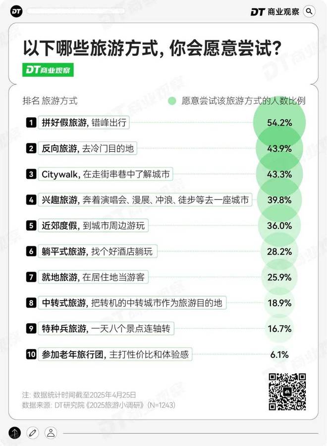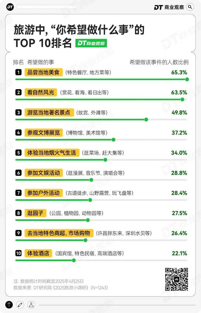 《DT商业观察》和《第一财经》联合发起了一份旅游调研,收集并分析了1243份问卷结果,发布《2025年轻人旅游趋势报告》。