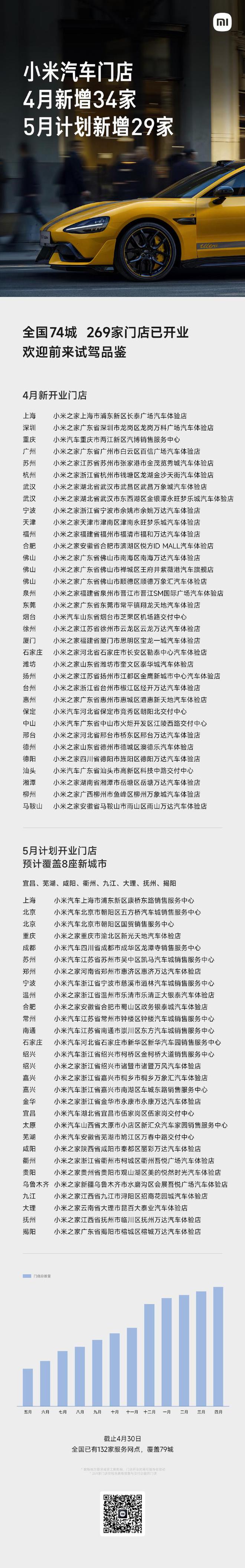 小米汽车公布开店新进展:4月新增34家门店,全国74城已有269家门店;5月计划新增29家门店,预计新增覆盖宜昌、芜湖等... 小米汽车公布开店新进展:4月新增34家门店,全国74城已有269家门店;5月计划新增29家门店,预计新增覆盖宜昌、芜湖等8座城市;截止4月30日,全国已有132家服务网点,覆盖全国79城。
