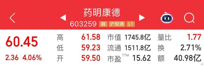 这是药明康德近三年来首次在第一季度交出双位数增长的“成绩单”。受此消息影响,截至4月29日收盘,药明康德A股报收60.45元,涨4.9%。