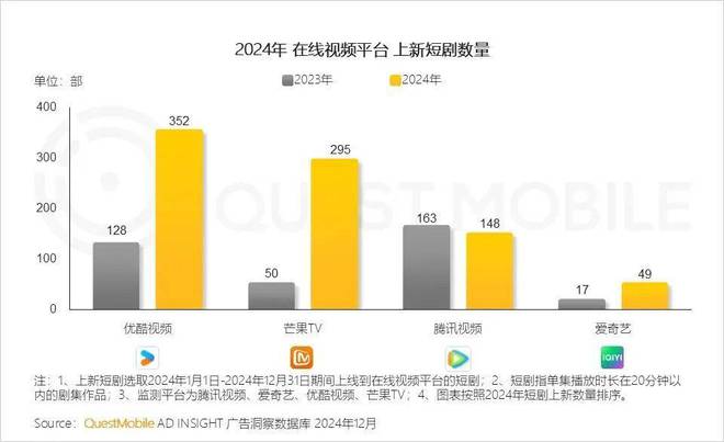 QuestMobile 统计了 2024 年在线视频平台的上新短剧数量,优酷视频以 352 部的上新数位列第一,与之相比爱奇艺去年的上新短剧仅有 49 部,在爱优腾芒四家平台中垫底。