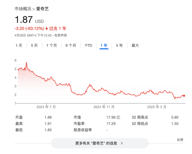 一年来,爱奇艺股价跌去了超过 60%,4 月份股价一度跌至 1.53 美元,是上市以来的最低点。它的股价至今还在 2 美元以下徘徊,都快成垃圾股了。